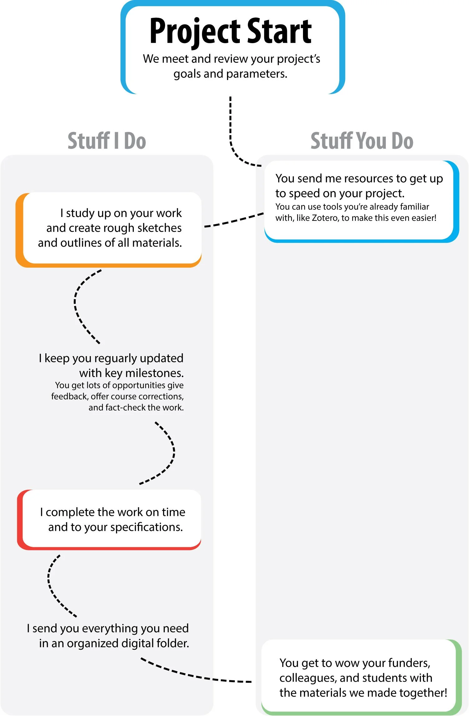 I develop and manage my projects with a careful eye for respecting the time and expertise of my clients. For each project I begin by familiarizing myself with your work and any literature you send me. We then create a plan together on how to meet your specific goals, budget, and deadlines. I’m a responsive, communicative, and professional project partner.